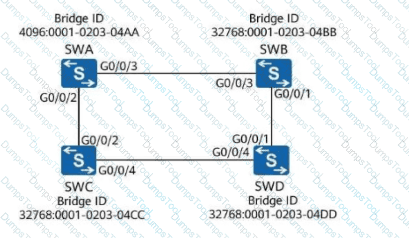As shown in the figure, all switches run STP. Assume that the path cost of all ports is 200. What is the root path cost contained in the configuration BPDU received by G0/0/4 on SWD?