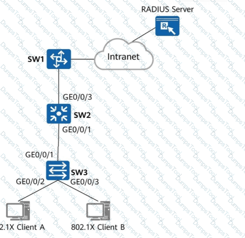 Which of the following steps are mandatory to enable 802.1X authentication on GE0/0/2 and GE0/0/3 of SW3 and configure a RADIUS server to authenticate and deliver network access rights to users?