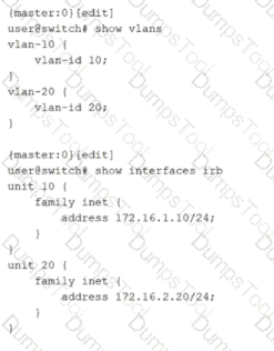 Inter-VLAN routing on Junos switching platforms is typically implemented by associating each VLAN or bridge domain with an IRB interface that provides the Layer 3 gateway for that VLAN. In the exhibit, VLAN 10 and VLAN 20 are defined with vlan-id values, and IRB logical units 10 and 20 already have IPv4 addresses assigned. However, the VLAN definitions do not yet reference the IRB interfaces. Without that association, hosts in the VLANs have no routed gateway on the switch, and the switch cannot perform Layer 3 forwarding between the two VLAN subnets.