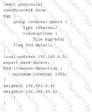 That time window is determined by the BFD detection time, which is calculated as the minimum-interval multiplied by the BFD multiplier. The multiplier represents how many BFD control packets can be missed before the session is considered failed. If the multiplier is not explicitly configured, Junos uses the default multiplier value of 3. Therefore, with minimum-interval set to 1000 ms and the default multiplier of 3, the detection time becomes 3000 ms. After approximately 3 seconds without receiving the expected BFD control packets, the BFD session transitions to down and BGP can react by treating the associated peer as unreachable for fast convergence.