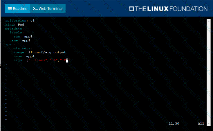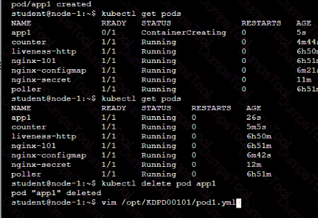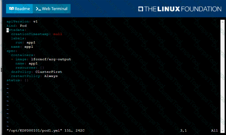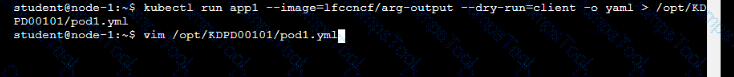 /opt/KDPD00101/podl.yml to create a pod named app1 that runs a container named app1cont using image Ifccncf/arg-output
