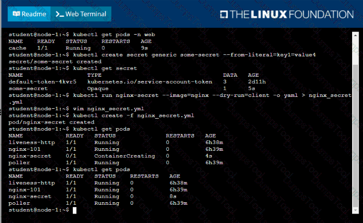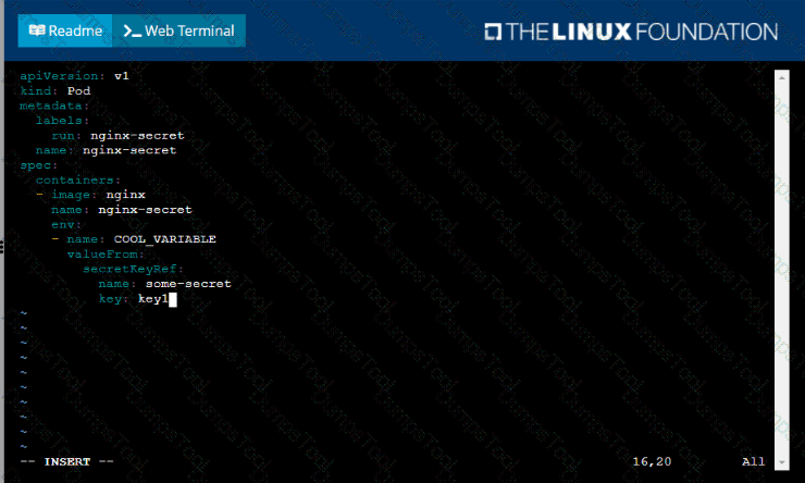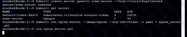 • Start an nginx pod named nginx-secret using container image nginx, and add an environment variable exposing the value of the secret key key 1, using COOL_VARIABLE as the name for the environment variable inside the pod