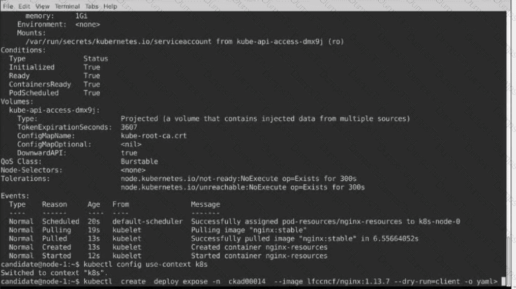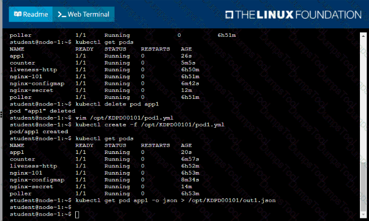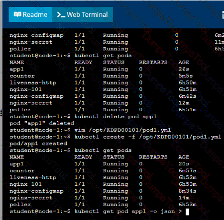 • When the pod is running display summary data about the pod in JSON format using the kubect1 command and redirect the output to a file named /opt/KDPD00101/out1.json