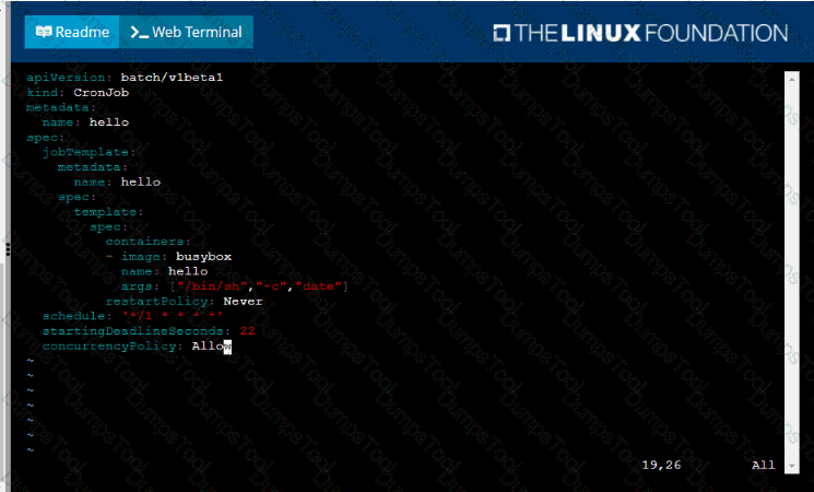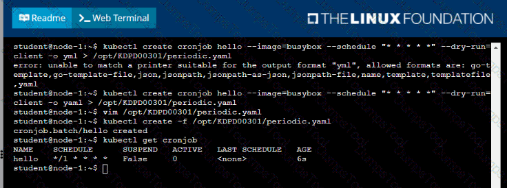 • Create a YAML formatted Kubernetes manifest /opt/KDPD00301/periodic.yaml that runs the following shell command: date in a single busybox container. The command should run every minute and must complete within 22 seconds or be terminated oy Kubernetes. The Cronjob namp and container name should both be hello