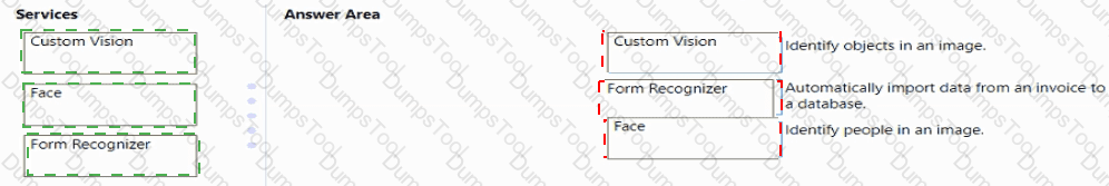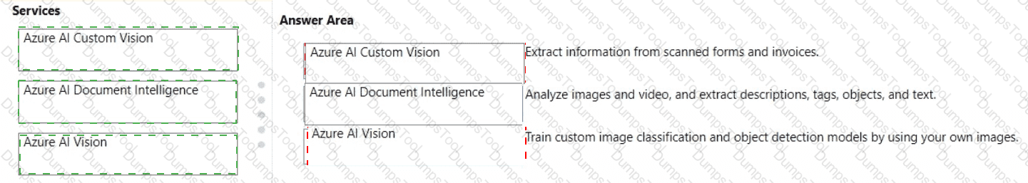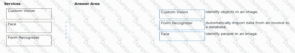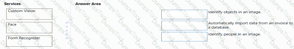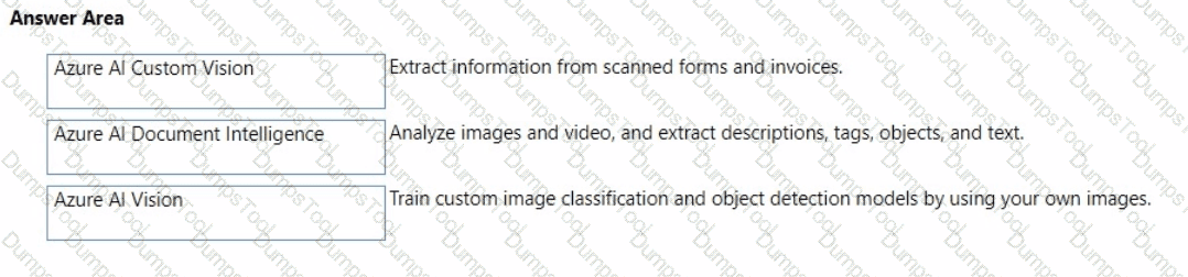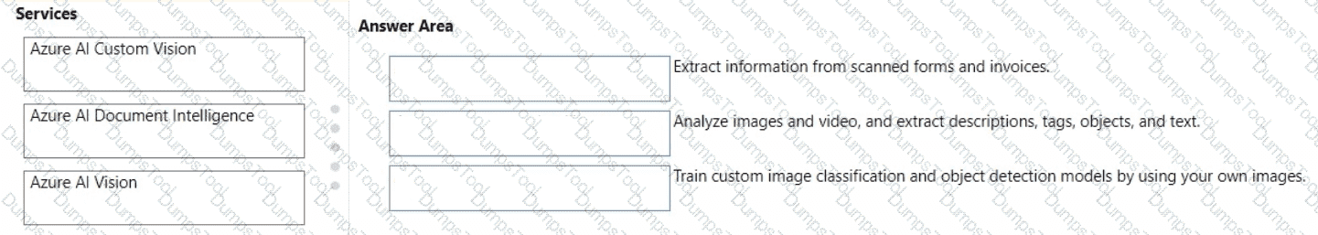 Extract data from medical admission forms for import into a patient tracking database → Azure AI Document IntelligenceFormerly known as Form Recognizer, this service belongs to the Azure AI Document Intelligence workload. It extracts key-value pairs, tables, and textual information from structured and semi-structured documents such as forms, invoices, and admission sheets. For medical forms, Document Intelligence can identify fields like patient name, admission date, and diagnosis and export them into structured formats for database import.