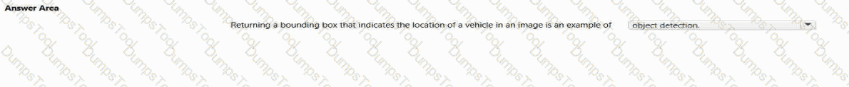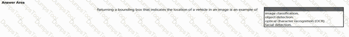 Therefore, based on the AI-900 study guide and Microsoft Learn materials, the verified and correct answer is Object detection, as it accurately describes the process of returning a bounding box indicating an object’s position in an image.