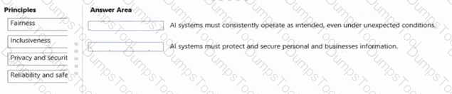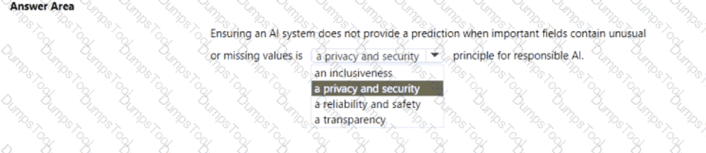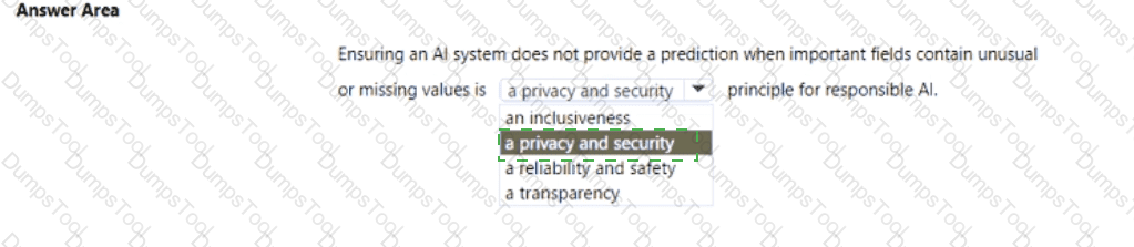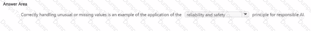In Microsoft’s Responsible AI framework, the Reliability and Safety principle ensures that AI systems perform consistently, safely, and as intended across diverse conditions — even when faced with incomplete, unusual, or unexpected data. Correctly handling unusual or missing values in a dataset directly demonstrates this principle, as it helps prevent faulty predictions, biased results, or unsafe system behaviors.