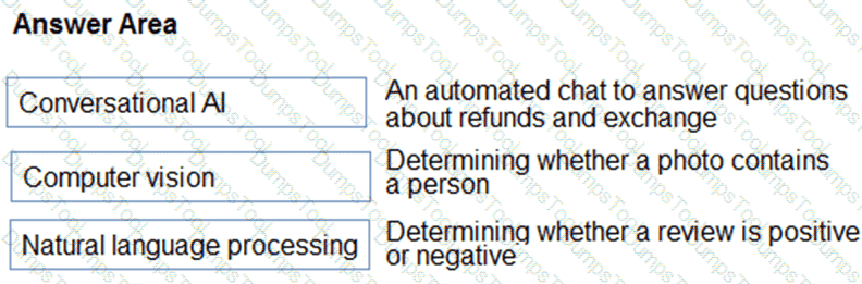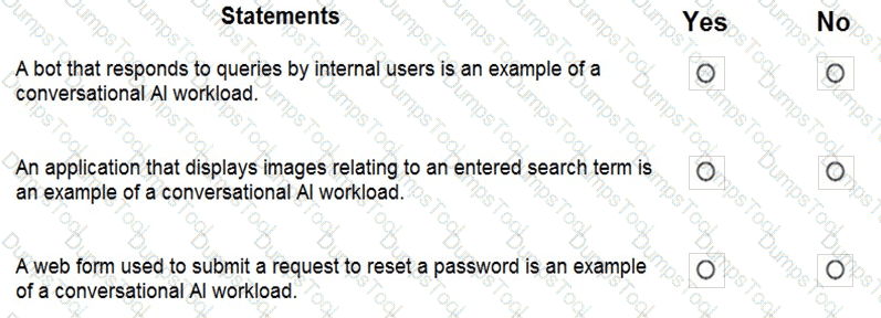 “An application that displays images relating to an entered search term is an example of a conversational AI workload.” → NOThis is not conversational AI because there is no dialogue or language understanding involved. It is an example of information retrieval or computer vision if it uses image recognition, but not conversation.