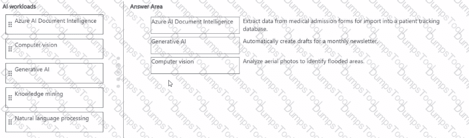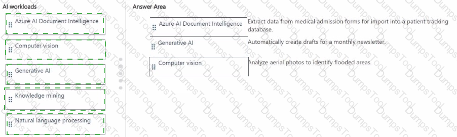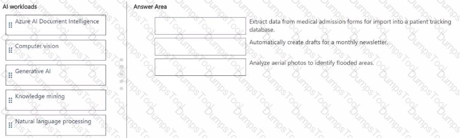 Automatically create drafts for a monthly newsletter → Generative AIThis task involves creating original written content, which is a capability of Generative AI. Microsoft’s Azure OpenAI Service uses large language models (like GPT-4) to generate human-like text, summaries, or articles. Generative AI workloads are ideal for automating creative writing, drafting newsletters, producing blogs, or summarizing reports.