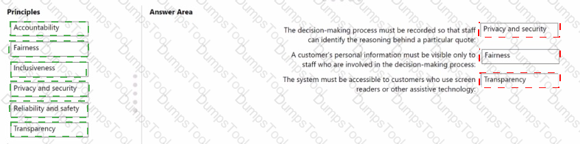 Transparency – This principle ensures that the AI’s decisions can be understood and explained. Recording the decision-making process and enabling staff to trace how a quote was generated aligns with transparency. It allows stakeholders to interpret the reasoning behind model outputs, ensuring that the AI behaves predictably and ethically.