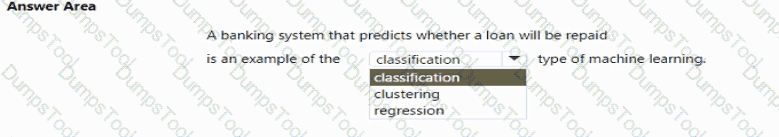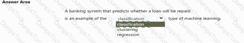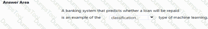 Therefore, per Microsoft’s official AI-900 learning objectives, a banking system predicting whether a loan will be repaid represents a classification type of machine learning problem.