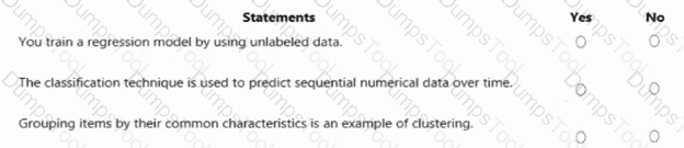 “The classification technique is used to predict sequential numerical data over time.” – No.Classification is used for categorical predictions, where outputs belong to discrete classes, such as spam/not spam or disease present/absent. Predicting sequential numerical data over time refers to time series forecasting, which is typically a regression or forecasting problem, not classification. The AI-900 syllabus clearly separates classification (categorical prediction) from regression (continuous value prediction) and time series (temporal pattern analysis).