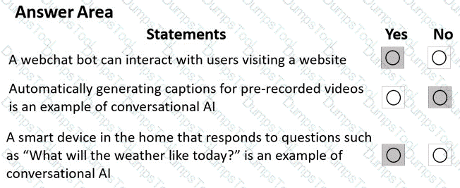 “A webchat bot can interact with users visiting a website.” – YesThis is true. A webchat bot represents an example of Conversational AI. It leverages natural language understanding (NLU) to interpret user input and generate appropriate responses. These bots can be created using Azure services such as Azure AI Bot Service and Language Understanding (LUIS). They enable automated interactions with users through text-based communication on websites, applications, or messaging platforms.