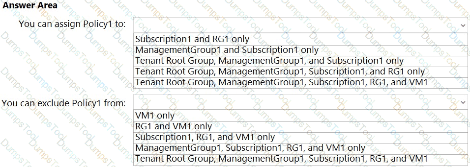 To which Azure resources can you assign Policy and which Azure resources can you specify as exclusions from Policy1? To answer, select the appropriate options in the answer
