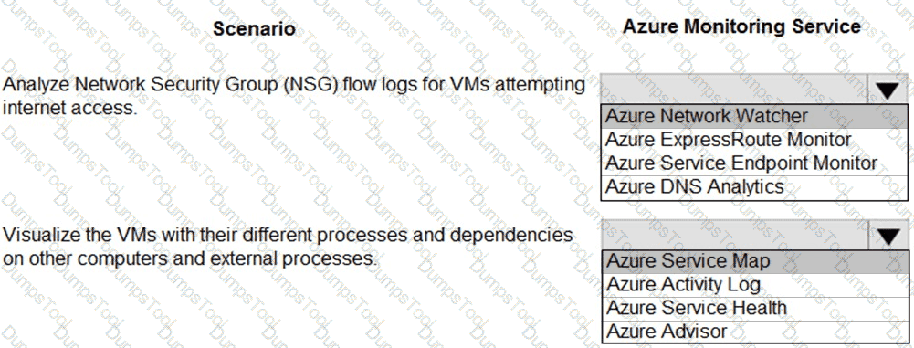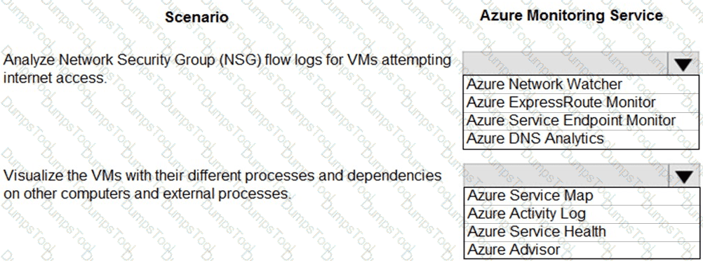 Which Azure monitoring services should you use? To answer, select the appropriate Azure monitoring services in the answer area.