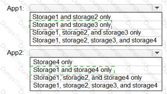 Which storage accounts should you recommend using for each app? To answer, select the appropriate options in the answer area.