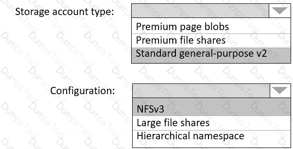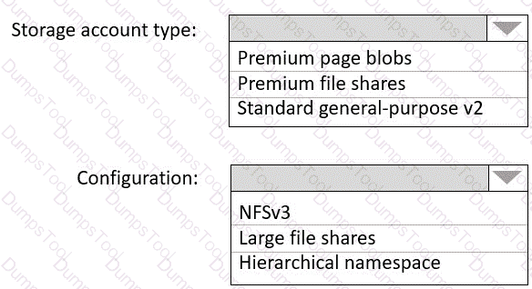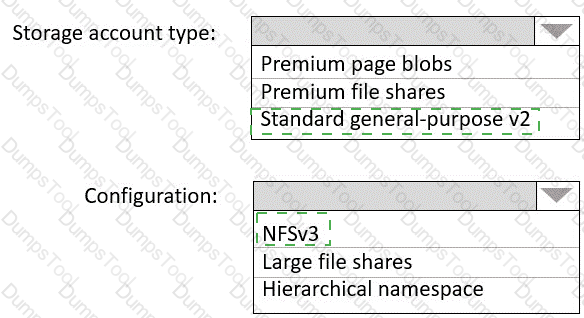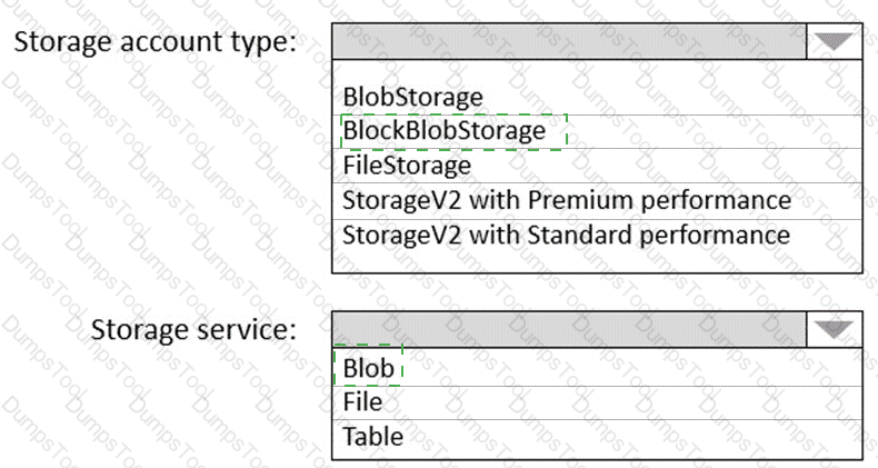 Which Azure Storage account type and storage service should you recommend? To answer, select the appropriate options in the answer area.