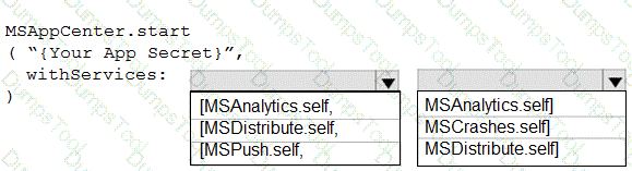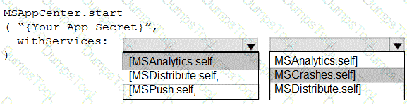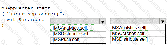 How should you complete the code to initialize App Center in the mobile application? To answer, select the appropriate options in the answer area.