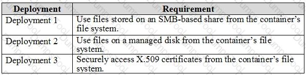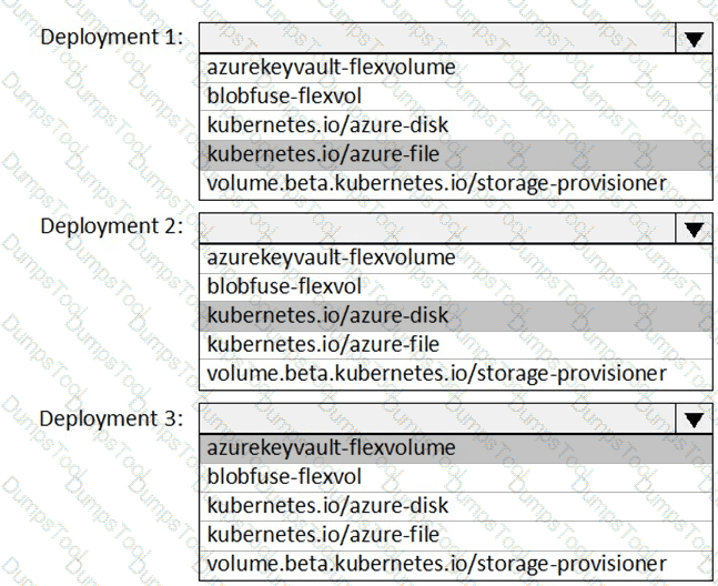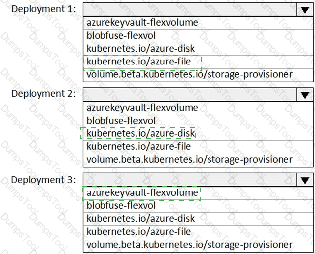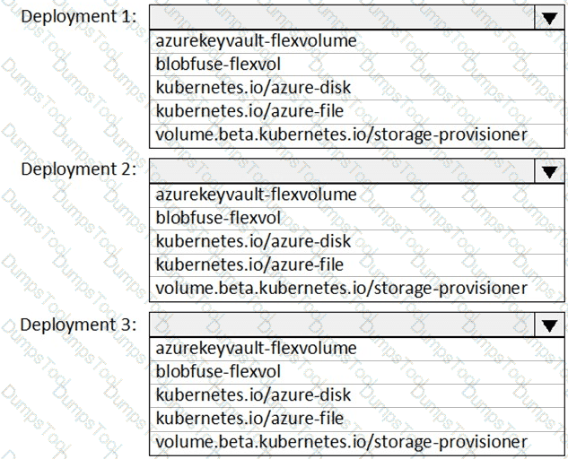 You need to create deployment files for an Azure Kubernetes Service (AKS) cluster. The deployments must meet the provisioning storage requirements shown in the following table.