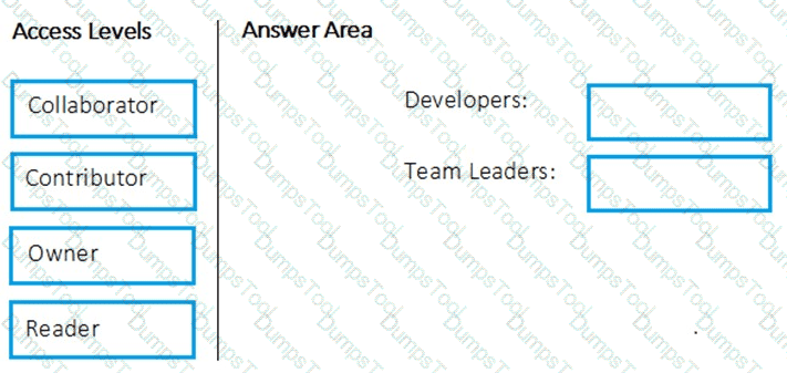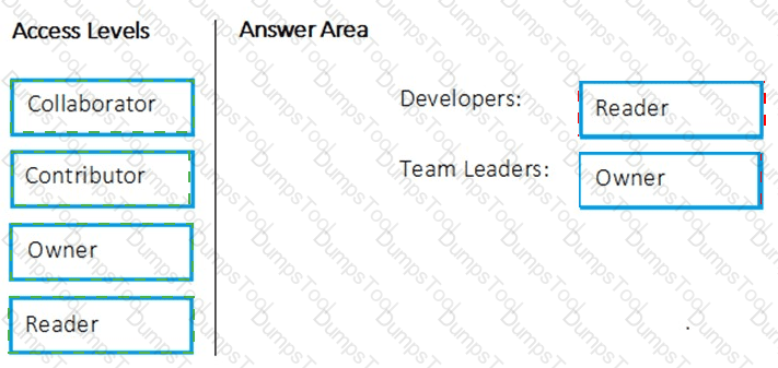 Which package feed access levels should be assigned to the Developers and Team Leaders groups for the investment planning applications suite? To answer, drag the appropriate access levels to the correct groups. Each access level may be used once, more than once, or not at all. You may need to drag the split bar between panes or scroll to view content.