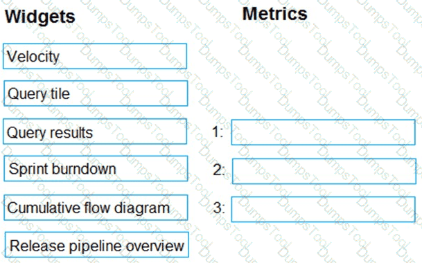Which widget should you use for each metric? To answer, drag the appropriate widgets to the correct metrics. Each widget may be used once, more than once, or not at all. You may need to drag the split bar between panes or scroll to view content.