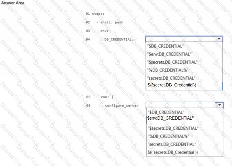 You have a GitHub organization that contains a repository and an organizational secret named DB.Credential. You need to build a workflow that will configure a server by using PowerShell and DB.Credential. How should you complete the code? To answer, select the appropriate options in the answer area.