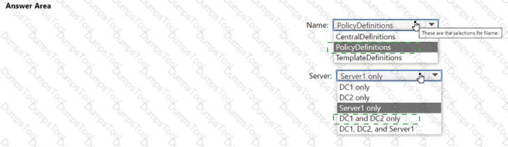 What should you name the folder, and on which server should you create the folder? To answer, select the appropriate options in the answer area.
