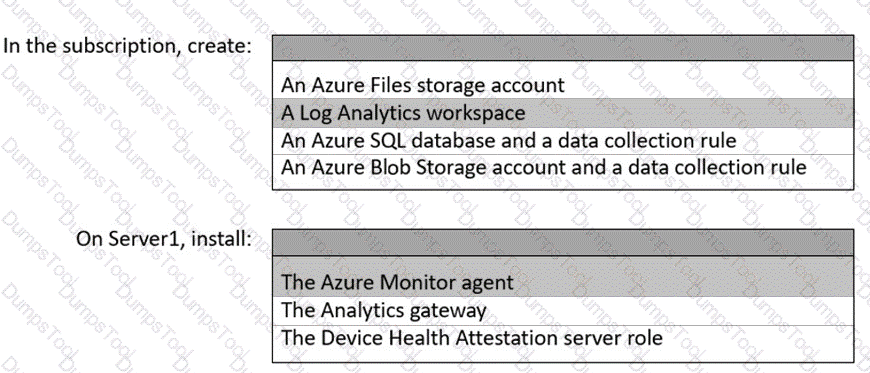 Which resources should you create in the subscription, and what should you install on Server1? To answer, select the appropriate options in the answer area.