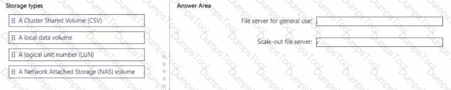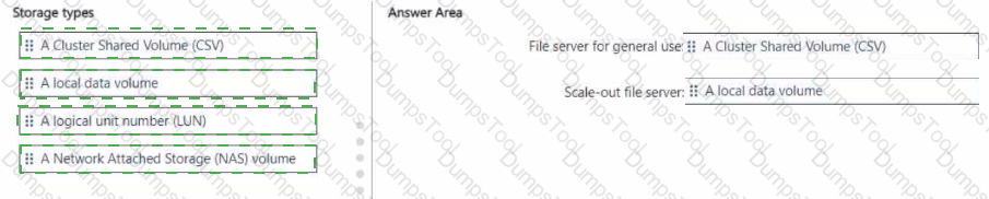 Which type of storage should you use for each file server? To answer, drag the appropriate storage types to the correct file servers. Each storage type may be used once, more than once, or not at all. You may need to drag the split bar between panes or scroll to view content.