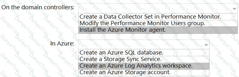 What should you do on the domain controllers, and what should you create on Azure? To answer, select the appropriate options in the answer area.