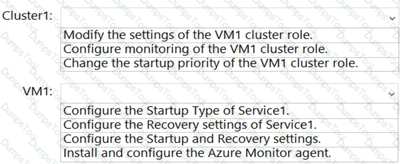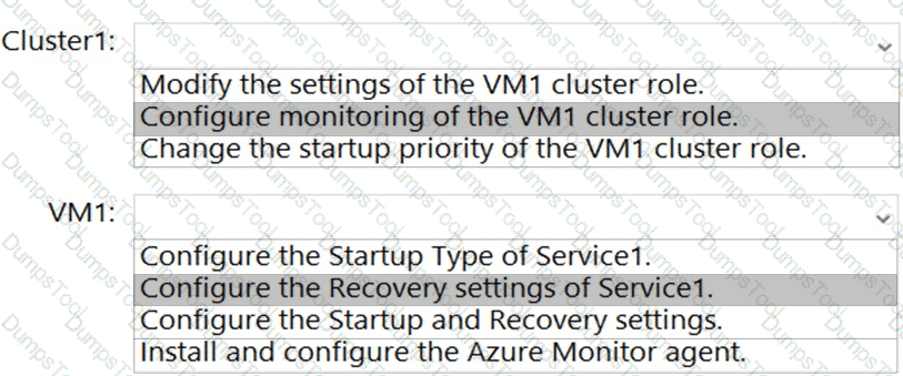 You need to fail over VM1 automatically to a different node when a service named Service1 on VM1 fails.