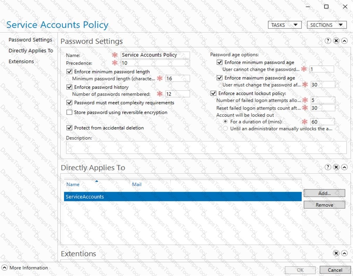 You create a Password Settings Object (PSO) as shown in the PSO exhibit. (Click the PSO tab.)