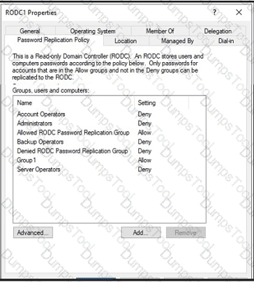 RODC1 has the Password Replication Policy shown in the following exhibit.