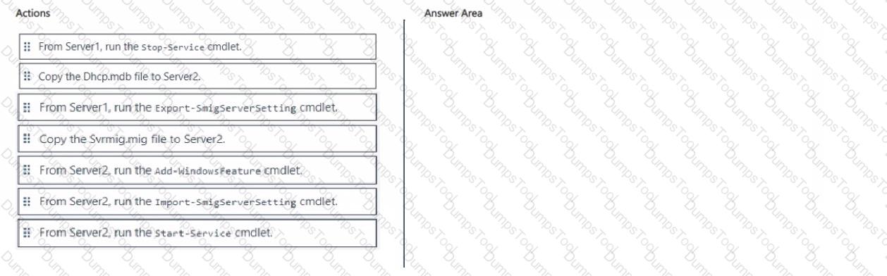 Server1 and Server2 are authorized as DHCP servers in the domain. You need to migrate the DHCP Server role from Server1 to Server2. Which five actions should you perform in sequence? To answer, move the appropriate actions from the list of actions to the answer area and arrange them in the correct order.