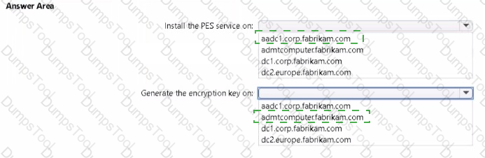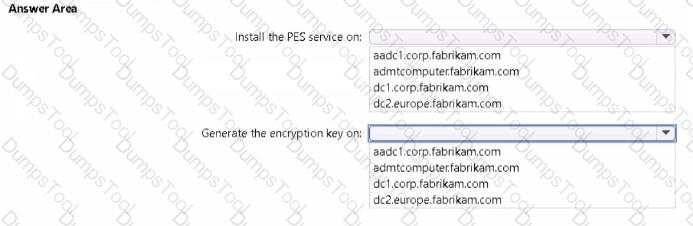 You are planning the europe.fabrikam.com migration to support the on-premises migration plan-Where should you install the Password Export Server (PES) service, where should you generate the encryption key? To answer, select the appropriate options in the answer area.