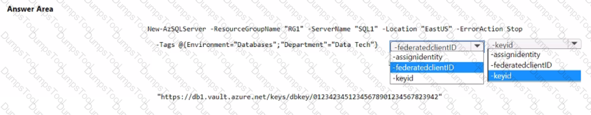 You need to deploy a logical SQL server by using PowerShell. The solution must ensure that the logical SQL server can create Azure AD users and provide Transparent Data Encryption (TDE} with a customer-managed key.