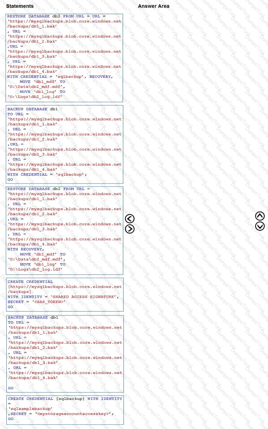 Which three Transact-SQL statements should you execute in sequence? To answer, move the appropriate statements from the list of statements to the answer area and arrange them in the correct order.