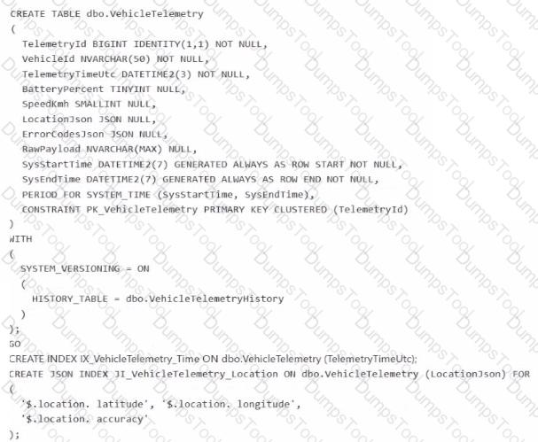 You need to create a table in the database to store the telemetry data. You have the following Transact-SQL code.