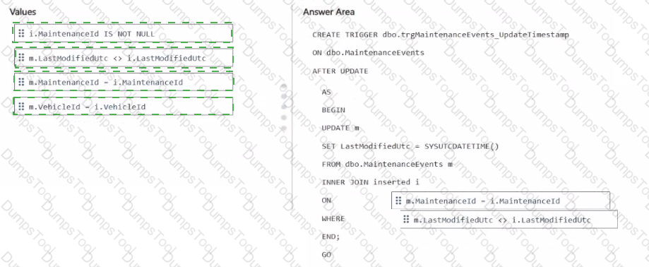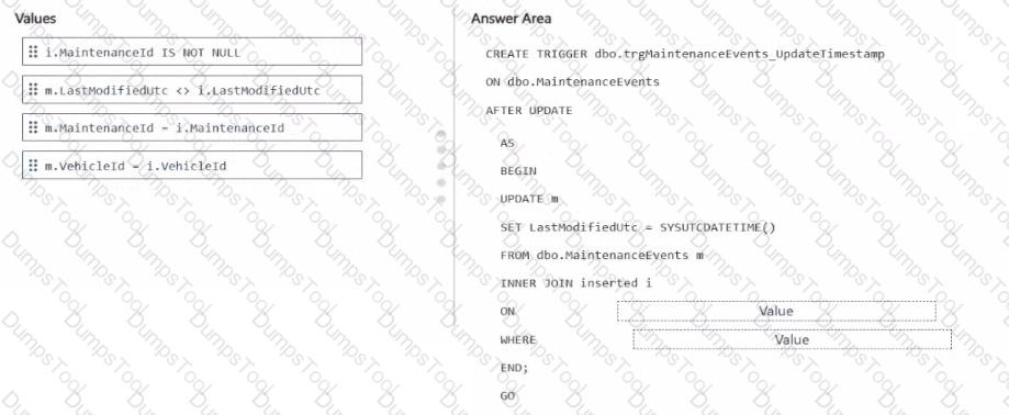 How should you complete the Transact-SQL code? To answer, drag the appropriate values to the correct targets. Each value may be used once, more than once, or not at all. You may need to drag the split bar between panes or scroll to view content.