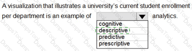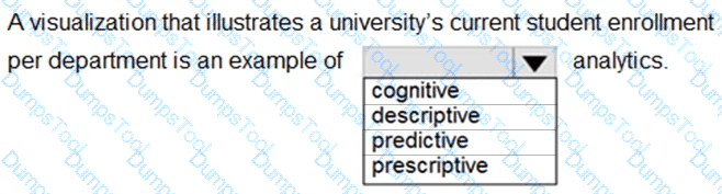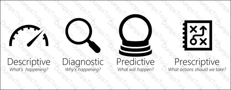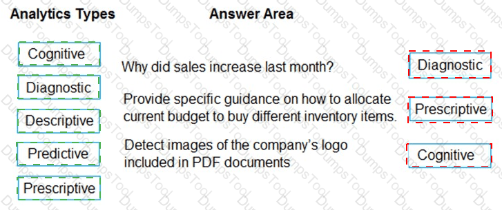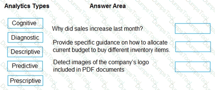 To answer, drag the appropriate analytics type from the column on the left to its question on the right. Each analytics type may be used once, more than once, or not at all.