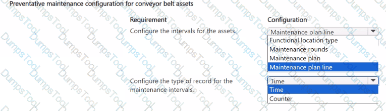 A company is using Dynamics 365 Supply Chain Management for its asset management operations. The company must manage periodic, preventative maintenance for two types of conveyor belt assets.