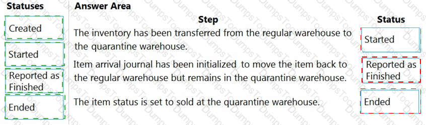 What is the status of the orders based on the location of the item? To answer, drag the appropriate statuses to the correct steps. Each status may be used once, more than once, or not at all. You may need to drag the split bar between panes or scroll to view content.