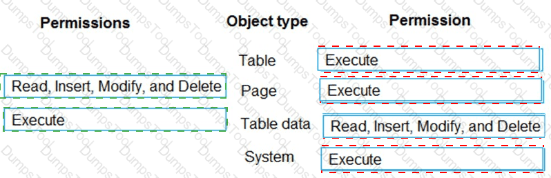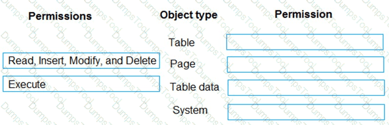 Which permission or set of permissions is allowed for each type of object? To answer, drag the appropriate permissions to the correct object types. Each permission set may be used once, more than once, or not at all. You may need to drag the split bar between panes or scroll to view content.