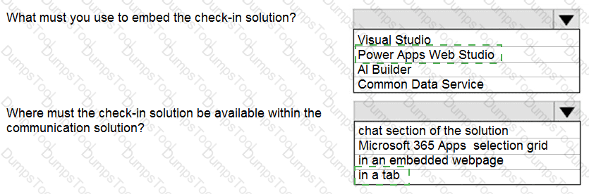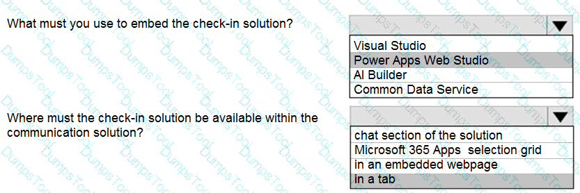 You need to embed the check-in solution into the communication solution. To answer, select the appropriate options in the answer area.
