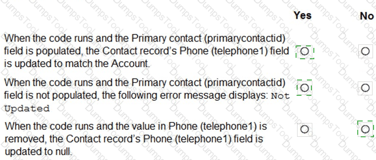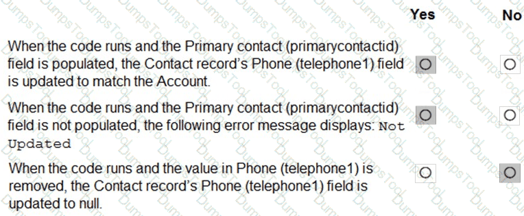 A model-driven app has the following JavaScript code. The code is attached to the OnChange event of the Phone (telephone1) field on the Account entity.