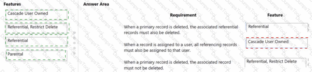 Which features should you select? To answer, drag the appropriate features to the correct requirements. Each feature may be used once, more than once, or not at all. You may need to drag the split bar between panes or scroll to view content.