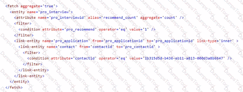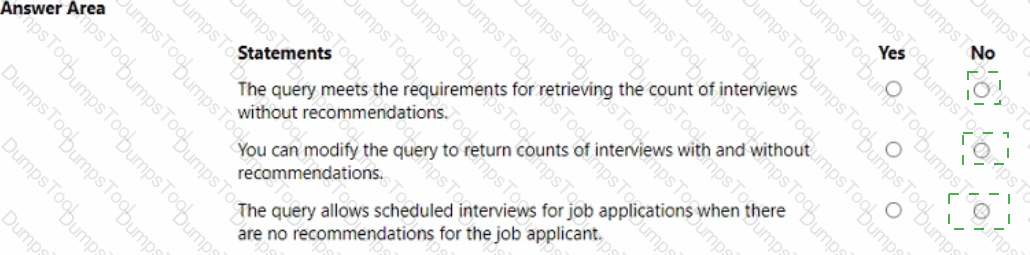 You create the following Fetch XML query to determine the number of interviews where there are no recommendations for an applicant.