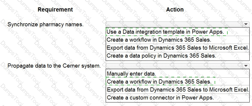 You need to synchronize pharmacy names and ensure that Dynamics 365 Sales data propagates correctly to the Cerner system.
