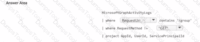 You need to identify all the security principals that submitted requests to change or delete groups. How should you complete the KQL query? To answer, select the appropriate options in the answer area.