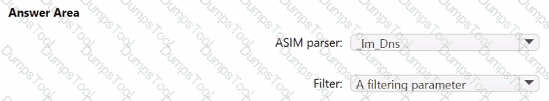 You need to implement the ASIM query for DNS requests. The solution must meet the Microsoft Sentinel requirements. How should you configure the query? To answer, select the appropriate options in the answer area. NOTE: Each correct selection is worth one point.